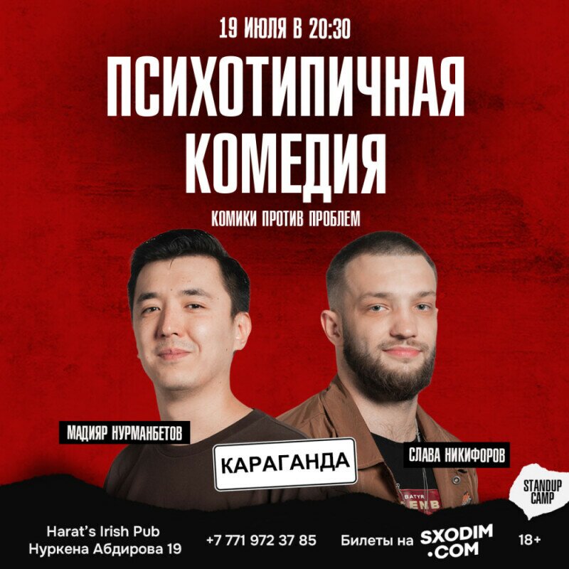 Психотипичная комедия — это интерактивное шоу Славы Никифорова и Мадияра Нурманбетова, где гости делятся своими ситуациями, а комики отвечают на них с юмором и дерзостью. Без гарантий решений, но со смехом, импровизацией и неожиданными советами — каждый уходит с улыбкой.