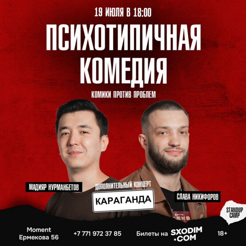 Психотипичная комедия — это интерактивное шоу Славы Никифорова и Мадияра Нурманбетова, где гости делятся своими ситуациями, а комики отвечают на них с юмором и дерзостью. Без гарантий решений, но со смехом, импровизацией и неожиданными советами — каждый уходит с улыбкой.