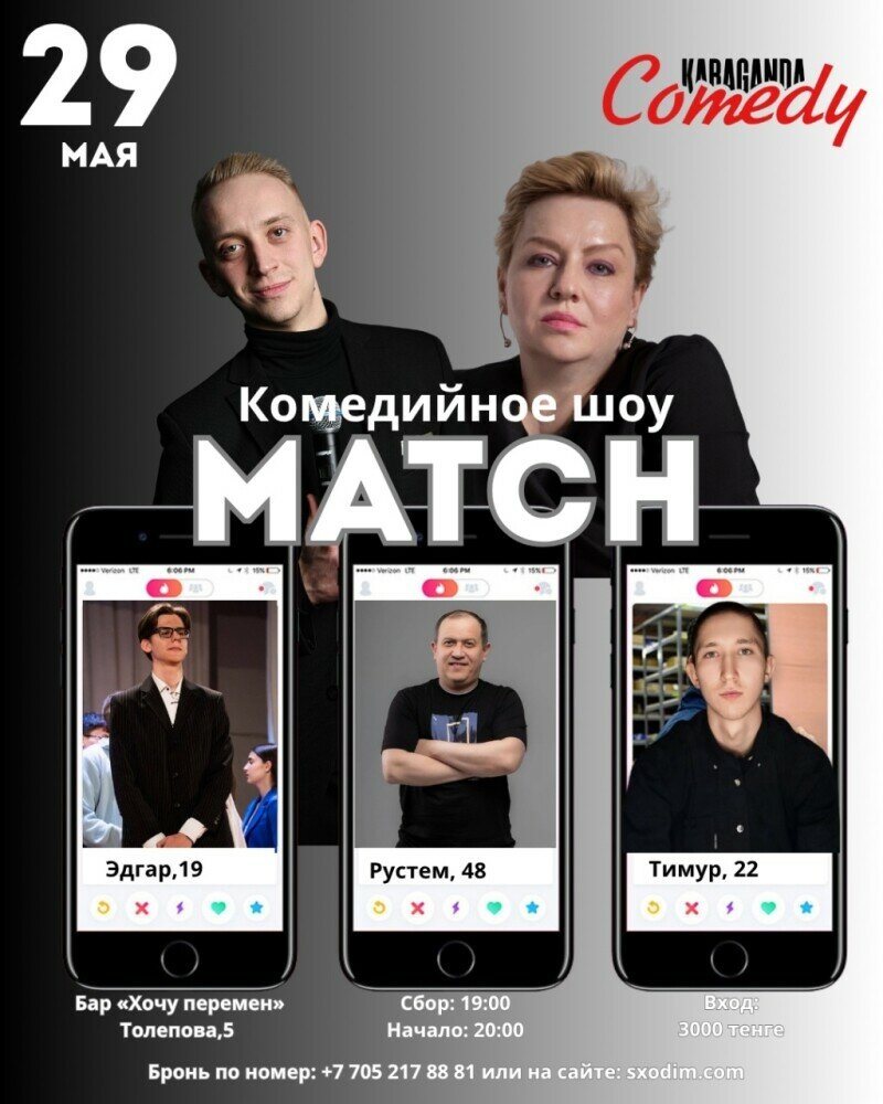 Шоу «Match» – первое дейтинг шоу в Караганде. Шоу в котором 3 комика будут бороться за сердце одной героини. А ведущий Сергей Станкевич будет им всячеки мешать и выводить на чистую воду.