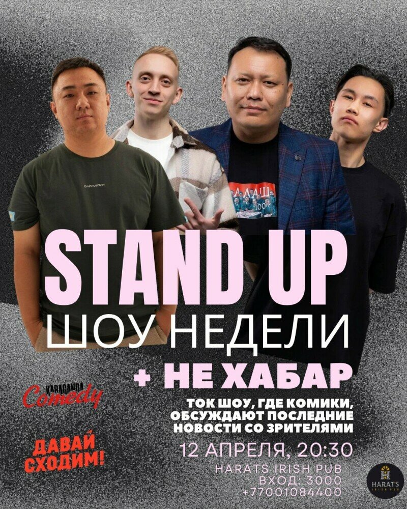 Четверо опытных и профессиональных комиков выступят с лучшим и обновленным материалом. Среди них участники проектов Stand Up Astana, Almaty Central, Рассмеши комика и других проектов Казахстана и СНГ.