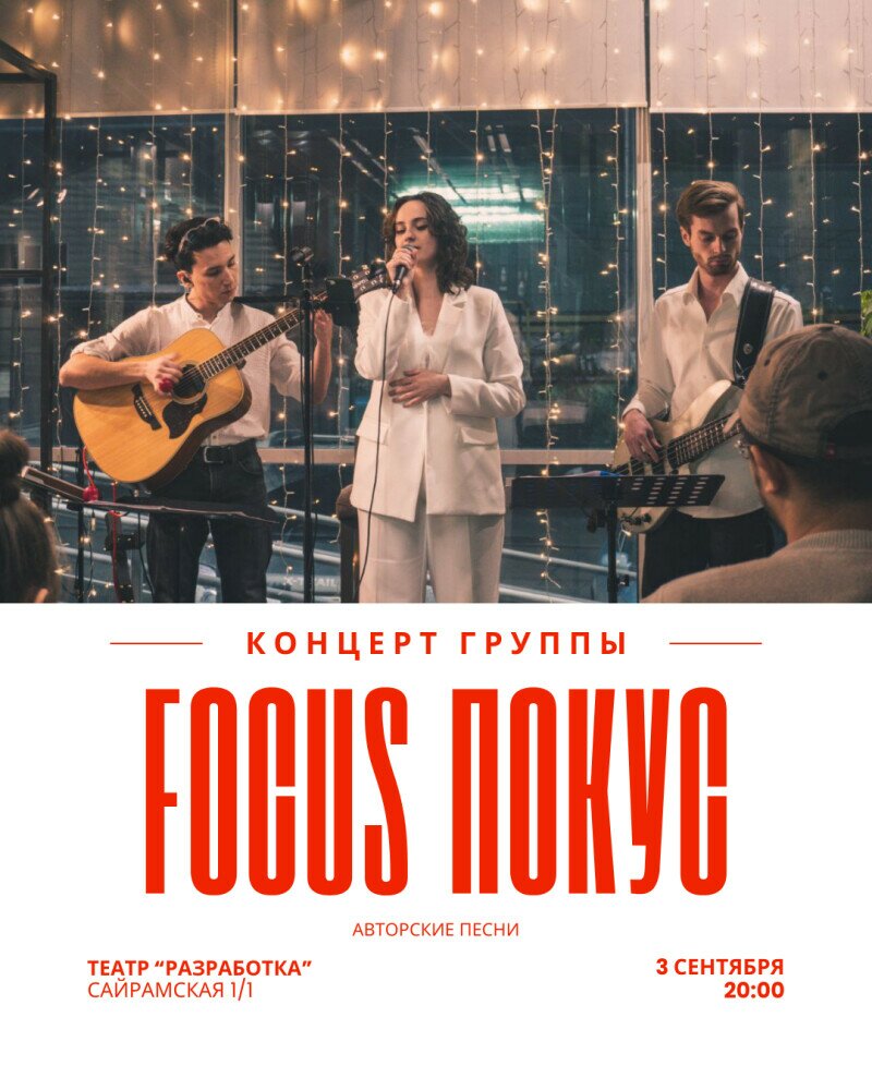 Они возвращаеются! Соскучились по авторским концертам? Мы тоже! Поэтому не смеем больше томить вас и приглашаем на концерт группы FOCUS покус! Вас ждёт презентация их новой песни, неожиданный перформанс с приглашенным гостем и, конечно, много авторской музыки! Приходите насладиться атмосферой, окунуться в волшебство песен и перевернуть календарь! До встречи в театре!