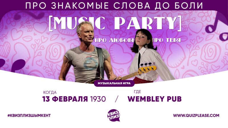 What is love? Ответьте на этот вопрос все вместе на самой романтичной [music party]. Вас ждут целых 8 раундов с треками про любовь, ну мёд, не иначе. А ещё эта игра — прекрасный вариант для первого свидания. И второго, и третьего... А можно и не для свидания, вы, главное, приходите. Вдруг ваша судьба поджидает вас именно на Квиз, плиз!? В общем, в любом случае регайтесь, а там разберётесь.